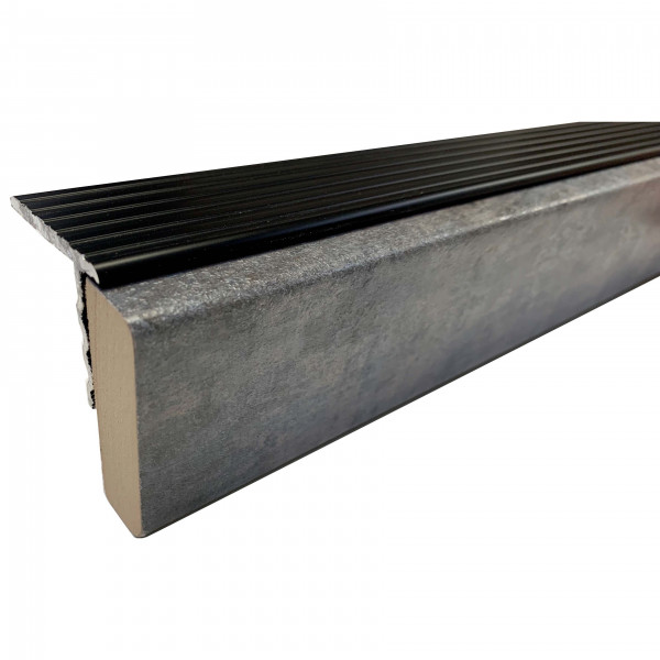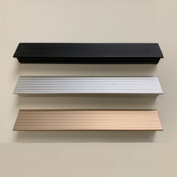 Geht es nach der letzten Stufe oben mit einem Teppich, Fliesenboden oder vorhandenem Laminatboden weiter, wird der Sockelaustritt verarbeitet. Die Übergangs-Aluleiste ist in den Farben Champagner, Silber und Schwarz erhältlich.